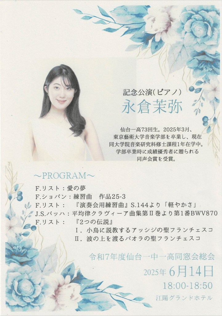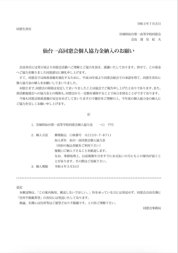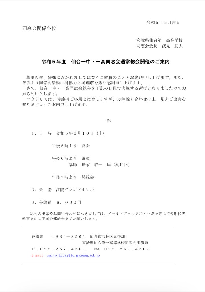 申込み方法など、詳細につきましては宮城県仙台第一高等学校東京同窓会ブログサイト https://sendai1-tokyo.net/archives/996 をご参照ください