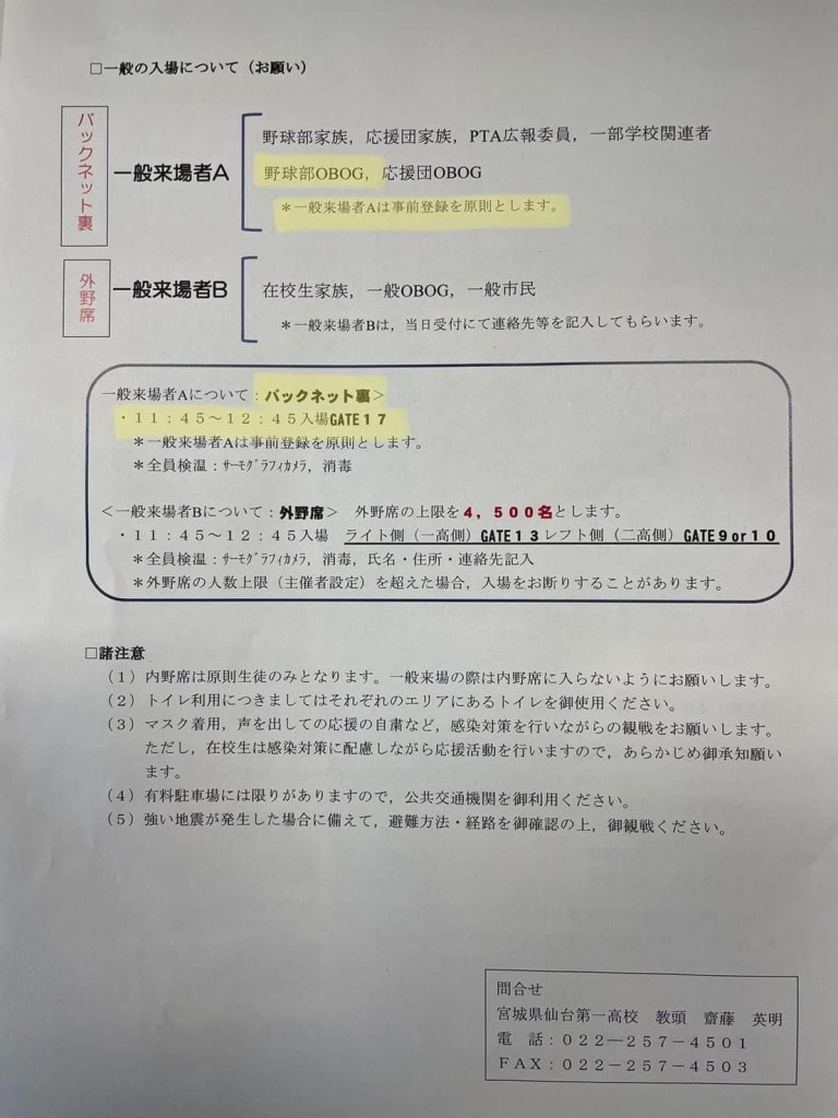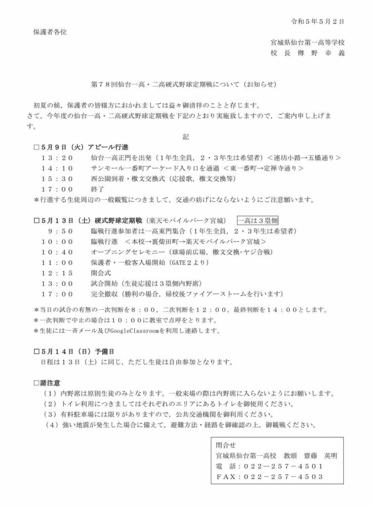 5月14日土曜日に開催されます一・二高野球定期戦ですが、本日現在での開催要綱がわかりましたのでお知らせ致します。今年は3年振りに有観客開催となりますが、球場内への入場方法、観戦方法については感染予防の観点から一部制限がございます。